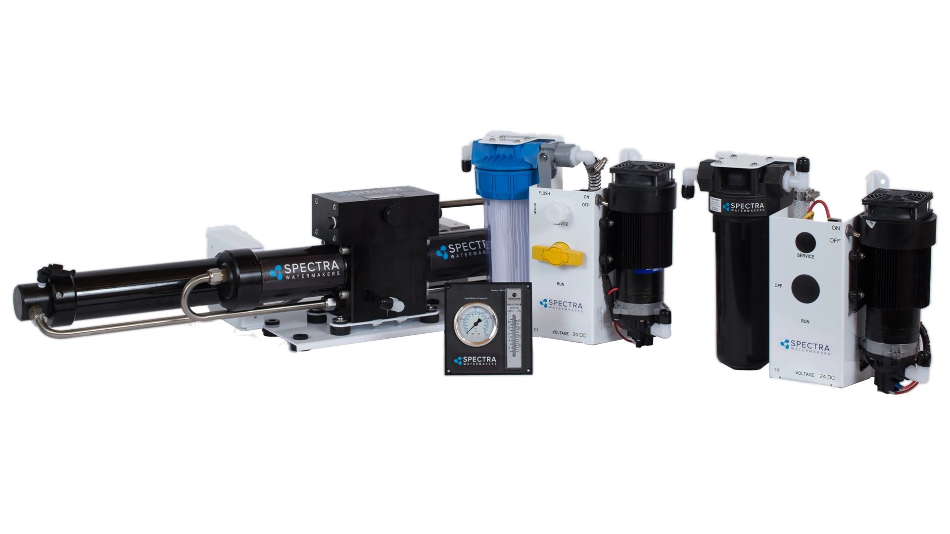 The Spectra Ventura series is engineered to be energy-efficient and lightweight. The compact, modular design, makes for easy installation in confined spaces. The Ventura 150 operates anywhere in the world and delivers over 6 gallons (24 litres) an hour. This system has analogue controls with an instrument panel containing a feed water pressure gauge and a product flow meter.