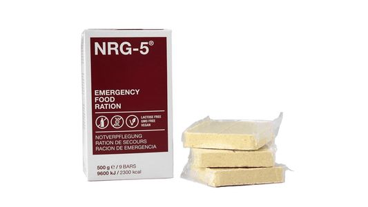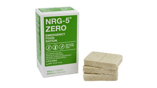 Gluten-Free Emergency Food Rations. A pack of NRG-5® (500g / 2300 kcal) covers the daily energy requirements of an adult. Ready-to-eat, no heating or boiling required. Can be given to children as of 6 months old. By crushing the compressed bars and adding water, you can prepare a nutritious mash or an energy drink, depending on how much water you add.